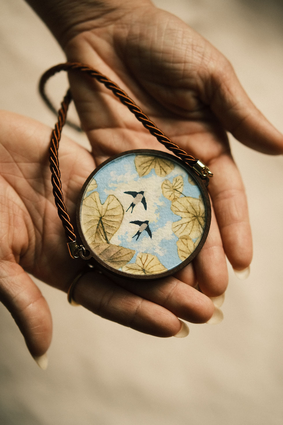 Os colares da Linha Preciosa são compostos por pingentes com base de madeira, tampa acrílica e aquarelas originais, desenvolvidas em papel importado 100% algodão. São peças leves, que se ajustam ao corpo de forma confortável. Todos os metais presentes nas correntes possuem banho de ouro ou ouro branco, sendo hipoalergênicos. Todos os elementos dos pingentes, inclusive as aquarelas, foram selados com verniz protetor específico para cada tipo de material.